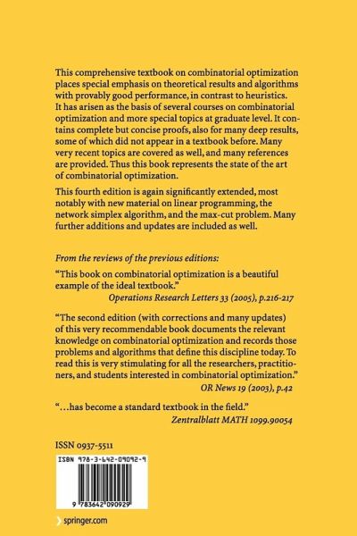 From the reviews of the 2nd Edition: "Provides a useful collection of the major techniques, results and references in combinatorial optimization for researchers and teachers in the field."- MATHEMATICAL REVIEWS "This book on combinatorial optimization is a beautiful example of the ideal textbook." Operations Resarch Letters 33 (2005), p.216-217 "The second edition (with corrections and many updates) of this very recommendable book documents the relevant knowledge on combinatorial optimization and records those problems and algorithms that define this discipline today. To read this is very stimulating for all the researchers, practitioners, and students interested in combinatorial optimization." OR News 19 (2003), p.42 From the reviews of the third edition: "In the last years Korte and J. Vygen's 'Combinational Optimization. Theory and Algorithms' has become a standard textbook in the field. 5 years after the first edition ... the 3rd revised edition is available. ... several proofs have been streamlined, the references have been updated and new exercises have been added. That makes this volume to one of the most comprehensive and up-to-date textbooks in the field of combinatorial optimization." Rainer E. Burkard, Zentralblatt MATH, Vol. 1099 (1), 2007 "This volume is an encyclopedic reference and textbook on theory and algorithms in combinatorial optimization. ... As befits a reference book, the references are very complete and up to date. ... The book has separate topic and author indexes and a very useful glossary of notation. ... The book ... will appeal primarily to readers who want an advanced textbook that can also serve as a concise reference. ... The current volume by Korte and Vygen is a worthy successor." Brian Borchers, MathDL, May, 2006
