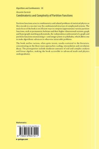 Partition functions arise in combinatorics and related problems of statistical physics as they encode in a succinct way the combinatorial structure of complicated systems. The main focus of the book is on efficient ways to compute (approximate) various partition functions, such as permanents, hafnians and their higher-dimensional versions, graph and hypergraph matching polynomials, the independence polynomial of a graph and partition functions enumerating 0-1 and integer points in polyhedra, which allows one to make algorithmic advances in otherwise intractable problems.