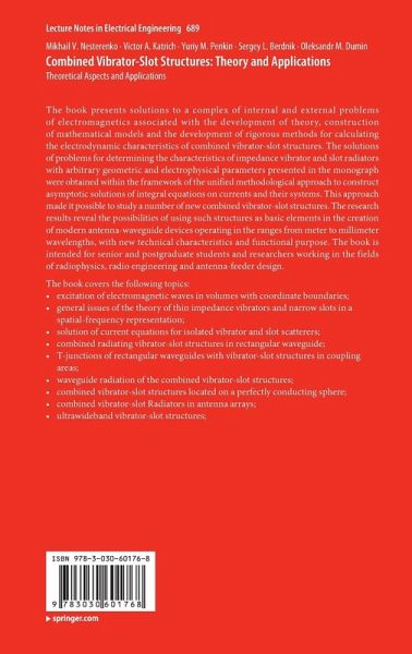 -excitation of electromagnetic waves in volumes with coordinate boundaries;-general issues of the theory of thin impedance vibrators and narrow slots in a spatial-frequency representation;-solution of current equations for isolated vibrator and slot scatterers;-combined radiating vibrator-slot structures in rectangular waveguide;-T-junctions of rectangular waveguides with vibrator-slot structures in coupling areas;-waveguide radiation of the combined vibrator-slot structures;-combined vibrator-slot structures located on a perfectly conducting sphere;-combined vibrator-slot Radiators in antenna arrays;-ultrawideband vibrator-slot structures;