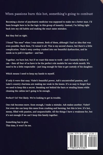 When passions burn this hot, something's going to combust. Becoming a doctor of psychiatric medicine was supposed to make me a better man. I'd been brought here to be the logic in this group of insanity. Instead, I'm falling right back into my old habits and making the exact same mistakes. But they feel so right. I found "the ones" when I was sixteen. Both of them, although I had no idea that was even possible. Back then, I'd ruined it all. This is my second chance, but there's a little complication. Violet's sexy cowboy crashed into our beautiful dysfunction, and he needs us to pull it together - and fast. Together, we burn hot, but if we want this mess to work - and I honestly believe it can - then all four of us have to be the perfect role models for one whole month. We need to be a little respectable - just long enough for him to get custody of his daughter. Which means I need to keep my hands to myself. If only it were that easy. Violet's beautiful power, Ash's uncontrolled passion, and Luke's country charisma are making me weak in the knees. It's so easy to forget that we need to keep this a secret. Sneaking out behind the barn or stealing kisses while cleaning the cabins isn't going to be enough. Perfect? Us? Not likely. We're looking to get in trouble. One risk becomes more. Soon enough, I make a mistake. Ash makes another. Violet? Not even she can keep this mess from crashing and burning, but this is love. It's hot, messy, filled with passion, and unquenchable. All the things I have a weakness for, but it's not enough if we can't keep this family together. Something has to give. This time, it won't be me.