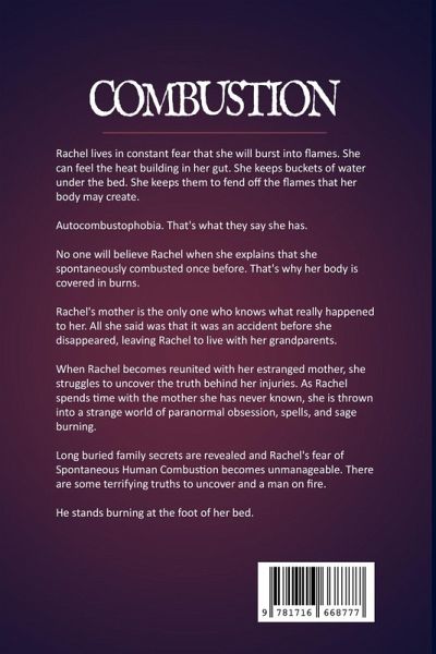 Rachel lives in constant fear that she will burst into flames. She can feel the heat building in her gut. She keeps buckets of water under the bed. She keeps them to fend off the flames that her body may create. Autocombustophobia. That's what they say she has. No one will believe Rachel when she explains that she spontaneously combusted once before. That's why her body is covered in burns. Rachel's mother is the only one who knows what really happened to her. All she said was that it was an accident, before she disappeared, leaving Rachel to live with her grandparents. When Rachel becomes reunited with her estranged mother, she struggles to uncover the truth behind her injuries. As Rachel spends time with the mother she has never known, she is thrown into a strange world of paranormal obsession, spells, and sage burning. Long buried family secrets are revealed and Rachel's fear of Spontaneous Human Combustion becomes unmanageable. There are some terrifying truths to uncover and a man on fire. He stands burning at the foot of her bed.