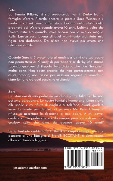 Pete La Tenuta Killarny si sta preparando per il Derby fra la famiglia Waters. Ricordo ancora la piccola Sara Waters e il modo in cui mi aveva afferrato e baciato nella stalla della proprietà dei Waters quando aveva 10 anni. L'ultima volta che l'avevo vista era quando stavo ancora con la mia ex moglie, Kelly. L'unica cosa buona di quel matrimonio era stata mia figlia, ora dodicenne. Da allora non avevo più avuto una relazione stabile. Quando Sara si è presentata al ranch per dirmi che suo padre non permetterà ai Killarny di partecipare al derby, che stiamo facendo qualcosa di illegale, beh, diciamo che non l'ho presa molto bene. Non esiste proprio che non parteciperemo, non esiste proprio, non riesco per nessuna ragione al mondo a stare lontano da quel corpicino eccitante. Sara Le istruzioni di mio padre erano chiare: dì ai Killarny che non possono gareggiare. Le nostre famiglie hanno una lunga storia alle spalle, e mi rifiuto di dirglielo al telefono, quindi guiderò verso la tenuta per dirglielo di persona. Ma Pete Killarny si rifiuta di accettare la decisione di mio padre. A chi dovrei credere: a mio padre che si è da sempre preso cura di me o al cowboy sexy che amo da quando avevo 10 anni? Se le fantasie ambientate in fienili e campi di grano unite al pensiero di una famiglia di fratelli ECCITANTI ti elettrizzano, allora continua a leggere...
