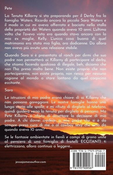 Pete La Tenuta Killarny si sta preparando per il Derby fra la famiglia Waters. Ricordo ancora la piccola Sara Waters e il modo in cui mi aveva afferrato e baciato nella stalla della proprietà dei Waters quando aveva 10 anni. L'ultima volta che l'avevo vista era quando stavo ancora con la mia ex moglie, Kelly. L'unica cosa buona di quel matrimonio era stata mia figlia, ora dodicenne. Da allora non avevo più avuto una relazione stabile. Quando Sara si è presentata al ranch per dirmi che suo padre non permetterà ai Killarny di partecipare al derby, che stiamo facendo qualcosa di illegale, beh, diciamo che non l'ho presa molto bene. Non esiste proprio che non parteciperemo, non esiste proprio, non riesco per nessuna ragione al mondo a stare lontano da quel corpicino eccitante. Sara Le istruzioni di mio padre erano chiare: dì ai Killarny che non possono gareggiare. Le nostre famiglie hanno una lunga storia alle spalle, e mi rifiuto di dirglielo al telefono, quindi guiderò verso la tenuta per dirglielo di persona. Ma Pete Killarny si rifiuta di accettare la decisione di mio padre. A chi dovrei credere: a mio padre che si è da sempre preso cura di me o al cowboy sexy che amo da quando avevo 10 anni? Se le fantasie ambientate in fienili e campi di grano unite al pensiero di una famiglia di fratelli ECCITANTI ti elettrizzano, allora continua a leggere...