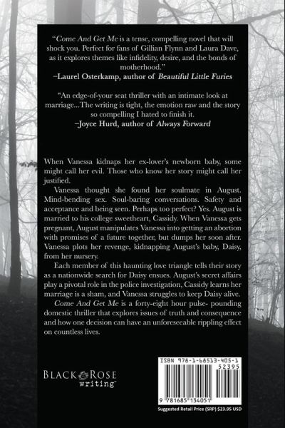 "...a harrowing journey into the depths of obsession, desperation, and the destructive power of unrequited love." -Gayle Brown, author of A Deadly Game When Vanessa kidnaps her ex-lover's newborn baby, some might call her evil. Those who know her story might call her justified. Vanessa thought she found her soulmate in August. Mind-bending sex. Soul-baring conversations. Safety and acceptance and being seen. Perhaps too perfect? Yes. August is married to his college sweetheart, Cassidy. When Vanessa gets pregnant, August manipulates Vanessa into getting an abortion with promises of a future together, but dumps her soon after. Vanessa plots her revenge, kidnapping August's baby, Daisy, from her nursery. Each member of this haunting love triangle tells their story as a nationwide search for Daisy ensues. August's secret affairs play a pivotal role in the police investigation, Cassidy learns her marriage is a sham, and Vanessa struggles to keep Daisy alive. Come And Get Me is a forty-eight hour pulse- pounding domestic thriller that explores issues of truth and consequence and how one decision can have an unforeseeable rippling effect on countless lives.