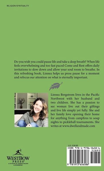 Do you wish you could pause life and take a deep breath? When life feels overwhelming and too fast paced Come and Rest offers daily invitations to slow down and allow your soul room to breathe. In this refreshing book, Linnea helps us press pause for a moment and refocus our attention on what is eternally important.