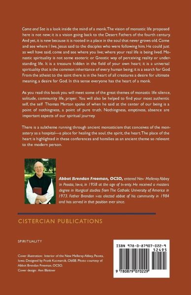 Come and See is look inside the mind of a monk. The Vision of monastic life proposed here is not new; it is a Vision going back to the Desert Fathers of the fourth century. And yet, it is new because it is rooted in a place in the soul that never grows old. Come and see where I live, Jesus said to the disciples who were following him. He could just as well have said, come and see where you live; where your real life is being lived. Monastic spirituality is not some esoteric or Gnostic way of perceiving reality or understanding life. It is a treasure hidden in the field of your own heart; it is a universal spirituality that is the common inheritance of every human being; it is a search for God. From the atheist to the saint there is in the heart of all creatures a desire for ultimate meaning, a desire for God. In this sense everyone has the heart of a monk. As you read this book you will meet some of the great themes of monastic life: silence, solitude, community life, prayer. You will also be helped to find your most authentic self, the self Thomas Merton spoke of when he said at the center of our being is a point of nothingness, a point of pure truth. Nothingness, emptiness, absence are important aspects of our spiritual journey. There is a subtheme running through ancient monasticism that conceives of the monastery as a hospital 'a place for healing the soul, the spirit, the heart. The place of the heart is highlighted in these conferences and homilies as an ancient theme so relevant to the modern person.