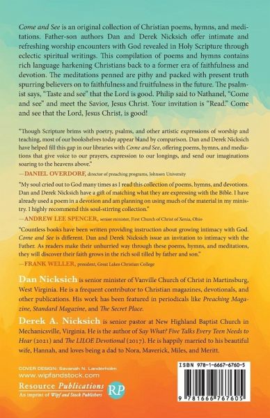 Come and See is an original collection of Christian poems, hymns, and meditations. Father-son authors Dan and Derek Nicksich offer intimate and refreshing worship encounters with God revealed in Holy Scripture through eclectic spiritual writings. This compilation of poems and hymns contains rich language harkening Christians back to a former era of faithfulness and devotion. The meditations penned are pithy and packed with present truth spurring believers on to faithfulness and fruitfulness in the future. The psalmist says, ""Taste and see"" that the Lord is good. Philip said to Nathanel, ""Come and see"" and meet the Savior, Jesus Christ. Your invitation is ""Read."" Come and see that the Lord, Jesus Christ, is good!