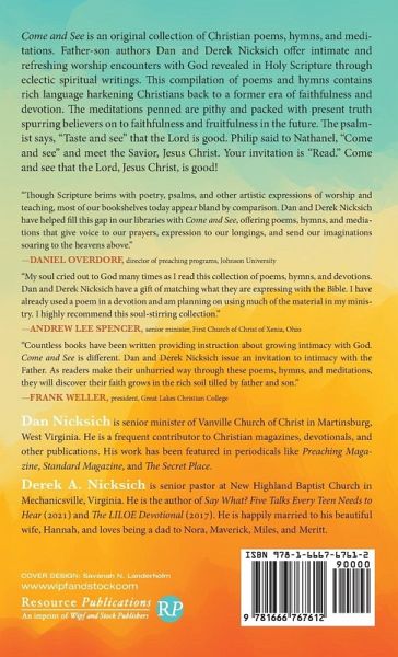 Come and See is an original collection of Christian poems, hymns, and meditations. Father-son authors Dan and Derek Nicksich offer intimate and refreshing worship encounters with God revealed in Holy Scripture through eclectic spiritual writings. This compilation of poems and hymns contains rich language harkening Christians back to a former era of faithfulness and devotion. The meditations penned are pithy and packed with present truth spurring believers on to faithfulness and fruitfulness in the future. The psalmist says, ""Taste and see"" that the Lord is good. Philip said to Nathanel, ""Come and see"" and meet the Savior, Jesus Christ. Your invitation is ""Read."" Come and see that the Lord, Jesus Christ, is good!