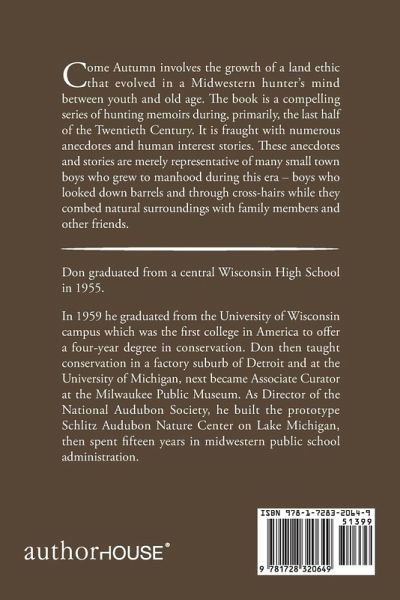 Come Autumn involves the growth of a land ethic that evolved in a Midwestern hunter's mind between youth and old age. The book is a compelling series of hunting memoirs during, primarily, the last half of the Twentieth Century. It is fraught with numerous anecdotes and human interest stories. These anecdotes and stories are merely representative of many small town boys who grew to manhood during this era - boys who looked down barrels and through cross-hairs while they combed natural surroundings with family members and other friends.