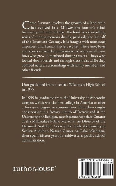 Come Autumn involves the growth of a land ethic that evolved in a Midwestern hunter's mind between youth and old age. The book is a compelling series of hunting memoirs during, primarily, the last half of the Twentieth Century. It is fraught with numerous anecdotes and human interest stories. These anecdotes and stories are merely representative of many small town boys who grew to manhood during this era - boys who looked down barrels and through cross-hairs while they combed natural surroundings with family members and other friends.