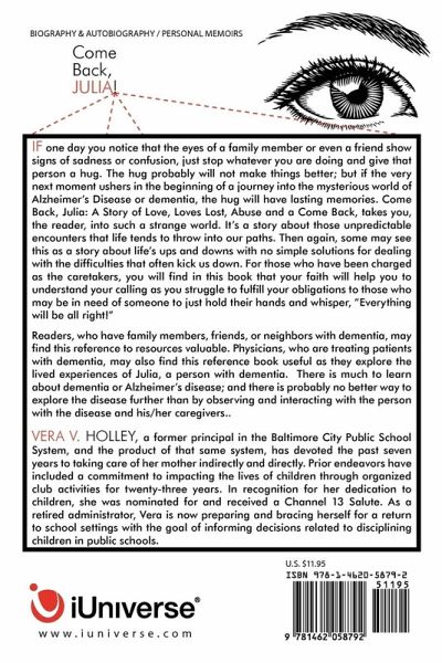 IF one day you notice that the eyes of a family member or even a friend show signs of sadness or confusion, just stop whatever you are doing and give that person a hug. The hug probably will not make things better; but if the very next moment ushers in the beginning of a journey into the mysterious world of Alzheimer's Disease or dementia, the hug will have lasting memories. Come Back, Julia: A Story of Love, Loves Lost, Abuse and a Come Back, takes you, the reader, into such a strange world. It's a story about those unpredictable encounters that life tends to throw into our paths. Then again, some may see this as a story about life's ups and downs with no simple solutions for dealing with the difficulties that often kick us down. For those who have been charged as the caretakers, you will find in this book that your faith will help you to understand your calling as you struggle to fulfill your obligations to those who may be in need of someone to just hold their hands and whisper, "Everything will be all right!" Readers of this valuable reference to resources and the experiences that are shared about Julia's struggles with Alzheimer's Disease or dementia can serve as a 'How To' reference; especially for those who are caregivers, family members who just are at wit's end, and even for those physicians out there who just want to walk in the shoes of patients like Julia, or to inform the decisions that they are expected to make for patients who may have such a debilitating disease like Alzheimer's or dementia.