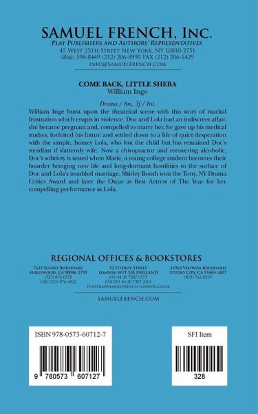 Drama / Characters: 8 male, 3 female Scenery: Interior William Inge burst upon the theatrical scene with this story of marital frustration which erupts in violence. Doc and Lola had an indiscreet affair, she became pregnant and, compelled to marry her, he gave up his medical studies, forfeited his future and settled down to a life of quiet desperation with the simple, homey Lola, who lost the child but has remained Doc's steadfast if slatternly wife. Now a chiropractor and recovering alcoholic, Doc's sobriety is tested when Marie, a young college student becomes their boarder bringing new life and long-dormant hostilities to the surface of Doc and Lola's troubled marriage. Shirley Booth won the Tony, NY Drama Critics Award and later the Oscar as Best Actress of The Year for her compelling performance as Lola.