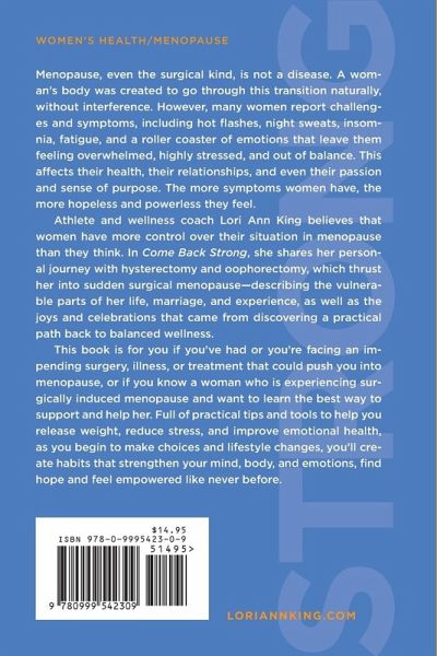 Menopause, even the surgical kind, is not a disease. A woman’s body was created to go through this transition naturally, without interference. However, many women report challenges and symptoms, including hot flashes, night sweats, insomnia, fatigue, and a roller coaster of emotions that leave them feeling overwhelmed, highly stressed, and out of balance. This affects their health, their relationships, and even their passion and sense of purpose. The more symptoms women have, the more hopeless and powerless they feel. Athlete and wellness coach Lori Ann King believes that women have more control over their situation in menopause than they think. In Come Back Strong, she shares her personal journey with hysterectomy and oophorectomy, which thrust her into sudden surgical menopause—describing the vulnerable parts of her life, marriage, and experience, as well as the joys and celebrations that came from discovering a practical path back to balanced wellness. This book is for you if you’ve had or you’re facing an impending surgery, illness, or treatment that could push you into menopause, or if you know a woman who is experiencing surgically induced menopause and want to learn the best way to support and help her. Full of practical tips and tools to help you release weight, reduce stress, and improve emotional health, as you begin to make choices and lifestyle changes, you’ll create habits that strengthen your mind, body, and emotions, find hope and feel empowered like never before.