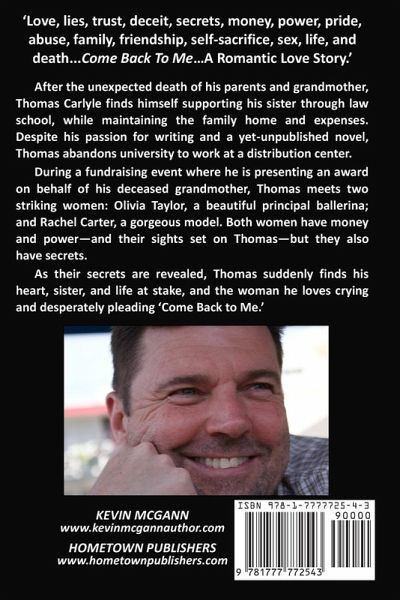 'Love, lies, trust, deceit, secrets, money, power, pride, abuse, family, friendship, self-sacrifice, sex, life, and death...Come Back To Me...A Romantic Love Story.' After the unexpected death of his parents and grandmother, Thomas Carlyle finds himself supporting his sister through law school, while maintaining the family home and expenses. Despite his passion for writing and a yet-unpublished novel, Thomas abandons university to work at a distribution center. During a fundraising event where he is presenting an award on behalf of his deceased grandmother, Thomas meets two striking women: Olivia Taylor, a beautiful principal ballerina; and Rachel Carter, a gorgeous model. Both women have money and power-and their sights set on Thomas-but they also have secrets. As their secrets are revealed, Thomas suddenly finds his heart, sister, and life at stake, and the woman he loves crying and desperately pleading 'Come Back to Me.' (12-12-25)