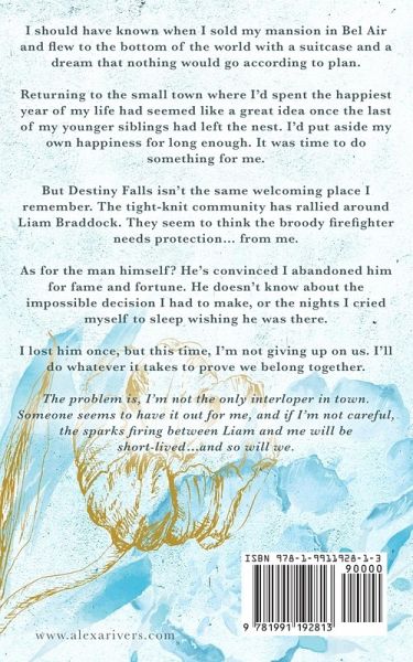 I should have known when I sold my mansion in Bel Air and flew to the bottom of the world with a suitcase and a dream that nothing would go according to plan. Returning to the small town where I'd spent the happiest year of my life had seemed like a great idea once the last of my younger siblings had left the nest. I'd put aside my own happiness for long enough. It was time to do something for me. But Destiny Falls isn't the same welcoming place I remember. The tight-knit community has rallied around Liam Braddock. They seem to think the broody firefighter needs protection... from me. As for the man himself? He's convinced I abandoned him for fame and fortune. He doesn't know about the impossible decision I had to make, or the nights I cried myself to sleep wishing he was there. I lost him once, but this time, I'm not giving up on us. I'll do whatever it takes to prove we belong together. The problem is, I'm not the only interloper in town. Someone seems to have it out for me, and if I'm not careful, the sparks firing between Liam and me will be short-lived...and so will we.