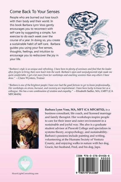 People who are burned out lose touch with their body and their world. In this book Barbara Lynn Voss gently encourages you to reconnect with self-care by suggesting a simple, fun exercise to do each week over the course of a year. In doing so, you create a sustainable habit of self-care. Barbara guides you using your five senses, thoughts, feelings, and intuition to encourage you to rediscover the joy in your life. burned