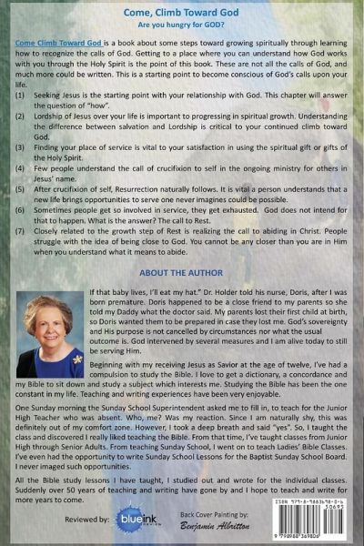 Come Climb Toward God is a book about some steps toward growing spiritually through learning how to recognize the calls of God. Getting to a place where you can understand how God works with you through the Holy Spirit is the point of this book. These are not all the calls of God, and much more could be written. This is a starting point to become conscious of God's calls upon your life. (1) Seeking Jesus is the starting point of your relationship with God. This chapter will answer the question of "how". (2) The Lordship of Jesus over your life is important to progress in spiritual growth. Understanding the difference between salvation and Lordship is critical to your continued climb toward God. (3) Finding your place of service is vital to your satisfaction in using the spiritual gift or gifts of the Holy Spirit. (4) Few people understand the call of crucifixion to self in the ongoing ministry for others in Jesus' name. (5) After crucifixion of self, Resurrection naturally follows. It is vital a person understands that a new life brings opportunities to serve one never imagined could be possible. (6) Sometimes people get so involved in service, that they get exhausted. God does not intend for that to happen. What is the answer? The call to Rest. (7) Closely related to the growth step of Rest is realizing the call to abide in Christ. People struggle with the idea of being close to God. You cannot be any closer than you are to Him when you understand what it means to abide.