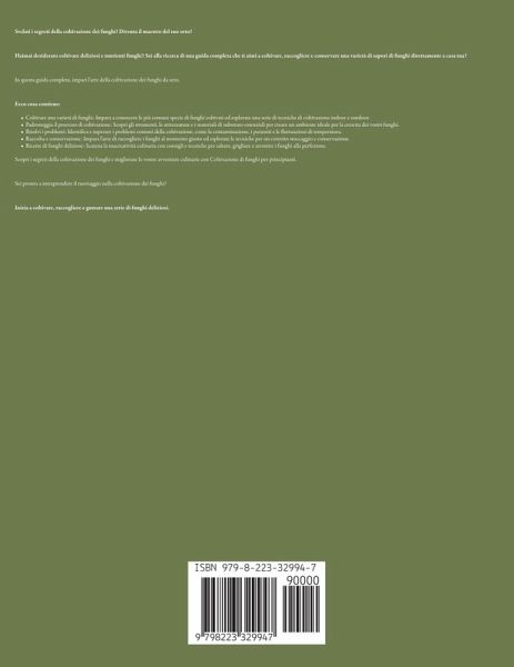 Svelati i segreti della coltivazione dei funghi! Diventa il maestro del tuo orto! Haimai desiderato coltivare deliziosi e nutrienti funghi? Sei alla ricerca di una guida completa che ti aiuti a coltivare, raccogliere e conservare una varietà di sapori di funghi direttamente a casa tua? In questa guida completa, impari l'arte della coltivazione dei funghi da zero. Ecco cosa contiene: Coltivare una varietà di funghi: Impara a conoscere le più comuni specie di funghi coltivati ed esplorate una serie di tecniche di coltivazione indoor e outdoor. Padroneggia il processo di coltivazione: Scopri gli strumenti, le attrezzature e i materiali di substrato essenziali per creare un ambiente ideale per la crescita dei vostri funghi. Risolvi i problemi: Identifica e superare i problemi comuni della coltivazione, come la contaminazione, i parassiti e le fluttuazioni di temperatura. Raccolta e conservazione: Impara l'arte di raccogliere i funghi al momento giusto ed esplorate le tecniche per un corretto stoccaggio e conservazione. Ricette di funghi deliziose: Scatena la tuacreatività culinaria con consigli e tecniche per saltare, grigliare e arrostire i funghi alla perfezione. Scopri i segreti della coltivazione dei funghi e migliorate le vostre avventure culinarie con Coltivazione di funghi per principianti. Sei pronto a intraprendere il tuoviaggio nella coltivazione dei funghi? Inizia a coltivare, raccogliere e gustare una serie di funghi deliziosi.
