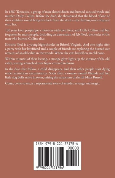 In 1887 Tennessee, a group of men chased down and burned accused witch and murder, Dolly Collins. Before she died, she threatened that the blood of one of their children would bring her back from the dead as the flaming roof collapsed onto her. 136 years later, people got a move on with their lives, and Dolly Collins is all but forgotten by most people. Including an descendant of Jeb Noel, the leader of the men who burned Collins alive. Kristina Noel is a young highschooler in Bristol, Virginia. And one night after a party with her boyfriend and a couple of friends are exploring the burned out remains of an old cabin in the woods. Where she cuts herself on an old bone. Within minutes of their leaving, a strange glow lights up the interior of the old cabin, leaving a hunched over figure covered in burns. In the days that follow, a child disappears, and then other people start dying under mysterious circumstances. Soon after, a woman named Rhonda and her little dog Bella arrive in town, raising the suspicions of sheriff Mark Russell. Come, come to me, is a supernatural story of murder, revenge and magic.