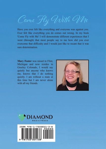 Have you ever felt like everything and everyone was against you. Ever felt like everything you do comes out wrong. In my book 'Come Fly with Me' I will demonstrate different experiences that I went (through) that most people say to me how did you ever overcome that difficulty and I would just like to recant that it was sure determination. Mary Foster was raised in Flint, Michigan and now resides in Greeley Colorado, I would say quietly but anyone who knows me, knows that I do nothing quietly. I am without a mate at this time but I am never alone with all my friends.