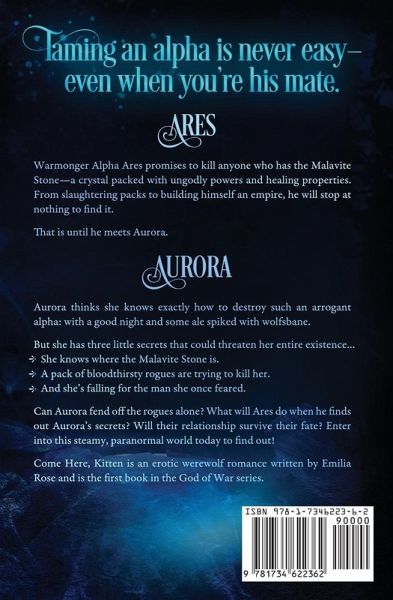 Taming an alpha is never easy-even when you're his mate. ARES Warmonger Alpha Ares promises to kill anyone who has the Malavite Stone-a crystal packed with ungodly powers and healing properties. From slaughtering packs to building himself an empire, he will stop at nothing to find it. That is until he meets Aurora. AURORA Aurora thinks she knows exactly how to destroy such an arrogant alpha: with a good night and some ale spiked with wolfsbane. But she has three little secrets that could threaten her entire existence... - She knows where the Malavite Stone is. - A pack of bloodthirsty rogues are trying to kill her. - And she's falling for the man she once feared. Can Aurora fend off the rogues alone? What will Ares do when he finds out Aurora's secrets? Will their relationship survive their fate? Enter into this steamy, paranormal world today to find out! Come Here, Kitten is an erotic werewolf romance written by Emilia Rose and is the first book in the God of War series.