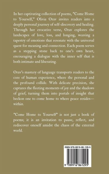 In her captivating collection of poems, "Come Home to Yourself," Olivia Orav invites readers into a deeply personal journey of self-discovery and healing. Through her evocative verse, Orav explores the landscapes of love, loss, and longing, weaving a tapestry of emotions that resonate with the universal quest for meaning and connection. Each poem serves as a stepping stone back to one's own heart, encouraging a dialogue with the inner self that is both intimate and liberating. Orav's mastery of language transports readers to the core of human experience, where the personal and the profound collide. With delicate precision, she captures the fleeting moments of joy and the shadows of grief, turning them into portals of insight that beckon one to come home to where peace resides-within. "Come Home to Yourself" is not just a book of poems; it is an invitation to pause, reflect, and rediscover oneself amidst the chaos of the external world. Copyright (c) 2024 Swan Charm Publishing