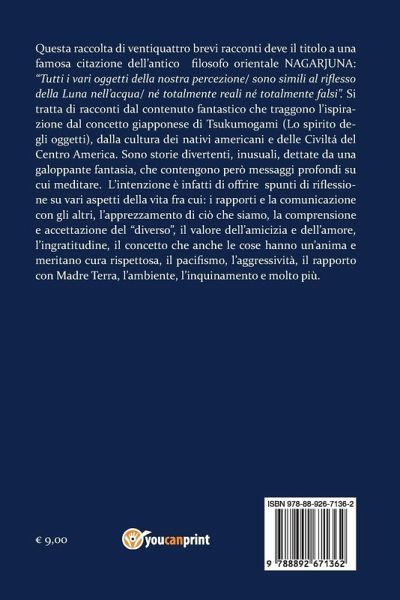 Questa raccolta di ventiquattro brevi racconti deve il titolo a una famosa citazione dell'antico filosofo orientale NAGARJUNA: "Tutti i vari oggetti della nostra percezione/ sono simili al riflesso della Luna nell'acqua/ né totalmente reali né totalmente falsi". Si tratta di racconti dal contenuto fantastico che traggono l'ispirazione dal concetto giapponese di Tsukumogami (Lo spirito degli oggetti), dalla cultura dei nativi americani e delle Civiltá del Centro America. L'intenzione è di presentare in modo fantasioso e divertente spunti di riflessione su vari aspetti della vita fra cui: i rapporti e la comunicazione con gli altri, l'apprezzamento di ciò che siamo e delle diversità, che sono da capire e accettare, il valore dell'amicizia e dell'amore, l'ingratitudine, il concetto che anche le cose hanno un'anima e meritano cura rispettosa, il pacifismo, l'aggressività, il rapporto con Madre Terra, l'ambiente e l'inquinamento.