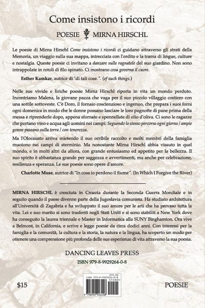 Questo libro di poesie in dodici capitoli di Mirna Hirschl presenta un'intima e suggestiva autobiografia della straordinaria vita dell'autrice. Attraverso il versatile strumento della poesia, Hirschl fornisce una visione rivelatrice e sfumata delle sue esperienze di vita a partire dalla Croazia durante la Seconda Guerra Mondiale e la Jugoslavia comunista, seguita dall'immigrazione negli Stati Uniti con il marito; si stabilirono nello Stato di New York dove poterono far crescere la famiglia, e in seguito nella baia di San Francisco dove attualmente vivono. La poetessa dà vita a molteplici strati di tempo e luoghi, condividendo con il lettore il suo stretto rapporto con la famiglia e la comunità, il suo fascino per l'arte e la storia ispirate e acquisite da numerosi viaggi ed un forte interesse per le lingue. Più che un'autobiografia, il libro è un prezioso documento storico con intuizioni personali e saggezza -- una testimonianza dell'esperienza della perdita, del desiderio e nelle sue stesse parole della sopravvivenza -- che ci mostrano la ricchezza e il potere che solo la poesia può fornire. Rimbalzerò di nuovo sulla terraferma e trarrò la forza della semplicità di un trillium selvatico
