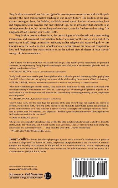 Tony Scully's poems in Come into the Light offer an outspoken conversation with the Gospels, arguably the most transformative teaching in our known history. The wisdom of the great masters among us, Jesus, the Buddha, and Mohammed, speak of universal compassion, love, and forgiveness. Jesus preaches that one will find God, not in invoking what amounts to an anthropomorphic idol, but in searching one's own heart, as in his fundamental teaching, ""the kingdom of God is within you"" (Luke 17:21). Tony Scully's poems address Jesus, the central figure of the Gospels, with questioning, irreverence, and occasional confrontation. In his view, many of the stories, even that of the resurrection itself, hinge on miracles, reflecting earlier religions that expected gods to cure illnesses, raise the dead, and even to walk on water, rather than on the powers of compassion, love, and forgiveness that characterize Jesus. In the author's view, the heart of Jesus is proof enough of his transcendence.