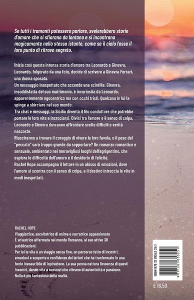 Se tutti i tramonti potessero parlare, svelerebbero storie d'amore che si sfiorano da lontano e si incontrano magicamente nello stesso istante, come se il cielo fosse il loro punto di ritrovo segreto. Inizia così questa intensa storia d'amore tra Leonardo e Ginevra. Leonardo, folgorato da una foto, decide di scrivere a Ginevra Ferrari, una donna sposata. Un messaggio inaspettato che accende una scintilla. Ginevra, insoddisfatta del suo matrimonio, è incuriosita da Leonardo, apparentemente egocentrico ma con occhi tristi. Qualcosa in lui la spinge a sbirciare nel suo mondo. Tra chat e messaggi, la Sicilia diventa il filo conduttore che potrebbe portare le loro vite a incrociarsi. Divisi tra l'amore e il senso di colpa, Leonardo e Ginevra dovranno affrontare scelte difficili e verità nascoste. Riusciranno a trovare il coraggio di vivere la loro favola, o il peso del "peccato" sarà troppo grande da sopportare? Un romanzo romantico e sensuale, ambientato nei meravigliosi luoghi dell'agrigentino, che esplora le difficoltà dell'amore e il desiderio di felicità. Rachel Hope accompagna il lettore in un abisso di emozioni, dove l'amore si scontra con il senso di colpa, e il destino intreccia le vite in modi inaspettati.