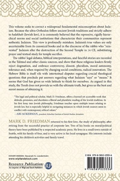 This volume seeks to correct a widespread fundamental misconception about Judaism. Because the ultra-Orthodox follow ancient Jewish traditions and strictly adhere to halakhah (Jewish law), it is commonly believed that the repressive, rigidly hierarchical norms and social institutions that characterize their communities represent authentic Judaism. This view is profoundly mistaken. Judaism's true values are only ascertainable from its canonical books and in the discourse of the rabbis who "reinvented" Judaism after the destruction of the Second Temple in 70 CE, substituting prayer and textual study for temple sacrifice. The rabbis' legal debates, biblical interpretations, and fanciful stories are recorded in the Talmud and other classic sources, and show that these religious leaders firmly reject dogmatism, and embrace controversy, dissent, pluralism, moral autonomy, tolerance and, when required by changing social conditions, radical innovation. The Hebrew Bible is itself rife with intertextual disputes regarding crucial theological questions that preclude pat answers regarding what Judaism "says" or "means." It seems that God has given us wide latitude to think for ourselves. As argued in this study, the Torah does not provide us with the ultimate truth, but gives us the best and surest means of obtaining it.