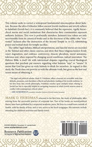This volume seeks to correct a widespread fundamental misconception about Judaism. Because the ultra-Orthodox follow ancient Jewish traditions and strictly adhere to halakhah (Jewish law), it is commonly believed that the repressive, rigidly hierarchical norms and social institutions that characterize their communities represent authentic Judaism. This view is profoundly mistaken. Judaism's true values are only ascertainable from its canonical books and in the discourse of the rabbis who "reinvented" Judaism after the destruction of the Second Temple in 70 CE, substituting prayer and textual study for temple sacrifice. The rabbis' legal debates, biblical interpretations, and fanciful stories are recorded in the Talmud and other classic sources, and show that these religious leaders firmly reject dogmatism, and embrace controversy, dissent, pluralism, moral autonomy, tolerance and, when required by changing social conditions, radical innovation. The Hebrew Bible is itself rife with intertextual disputes regarding crucial theological questions that preclude pat answers regarding what Judaism "says" or "means." It seems that God has given us wide latitude to think for ourselves. As argued in this study, the Torah does not provide us with the ultimate truth, but gives us the best and surest means of obtaining it.