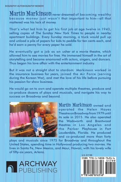 A rich memoir by a former Broadway theatre owner and producer who relays in his intimate, easy voice his journey from an outsider to a self-made successful player in a most competitive, but little understood business. We are treated to a truly remarkable American story of dreams fulfilled on Broadway and beyond. As you will read, Marty Markinson has lived an extraordinary life. Marty rose from modest means and obscurity to wealth, respectability and significant influence through a combination of laudable qualities - including honesty, courage, grit, creativity, high hopes, positive intentions plus a lot of hard work. And Marty had fun all the way to the top of his profession.Markinson talks about his involvement in both production of shows and operation of the houses in which they appear, concentrating on his ownership of the Helen Hayes Theatre (previously known as The Little Theatre) on Broadway from 1979 until the theatre's sale in 2015. A fun, informative personal telling of this Broadway tale. From the Author's Foreword It was a night that changed my life forever: June 5, 1983. Arlena, my wife, and I were at the Uris Theatre in New York City for the 37th Annual Tony Awards. That year, Richard Burton, Lena Horne, and Jack Lemmon hosted the event. The orchestra's Special Salute consisted of a medley of George Gershwin songs beautifully sung by an array of celebrities. Then, at the end of the musical salute, the Uris Theatre was officially renamed the Gershwin Theatre. My feelings of apprehension were indescribable. We were sitting near the front of the theatre surrounded by the people who helped to make Broadway - Broadway. All of us we were poised to hear the announcement of the winner for Best Play in the 1982-83 season. My heart was pounding almost out of my chest. I was beyond excited because the show I was producing, Torch Song Trilogy, was one of the nominees. Everyone in the theatre industry knew it was a long shot because a show entitled 'night, Mother, by Pulitzer Prize-winner Marsha Norman, was expected to take the Tony, hands down. Torch Song Trilogy was a groundbreaker, the first on Broadway that in my opinion fearlessly embraced the gay world. I was concerned as to whether the theatre industry or the theatre-going public would ever fully accept this show. Thoughts and memories flooded my mind. I'd always loved the entertainment business. Growing up, I went to as many movies and plays as I possibly could. But how could I ever have imagined back then that one day I would be sitting at the Tony Awards with a Broadway show that I had produced in the running for a Tony?When the time came to announce the winner, I happened to glance over at the 'night, Mother producer and it seemed to me that he was preparing to stand up. Then the presenter opened the envelope, saying, as they always do, "And the winner is ..." She gasped. "Oh, my God! The winner is Torch Song Trilogy!" The audience went wild. I just sat there completely stunned. Then it dawned on me that I was expected to get up and accept the Award with the fabulous Torch Song team of co-producers and, of course, the extraordinarily gifted author and star of Torch Song, Harvey Fierstein. I leaned over to kiss my wife and ran up the stairs onto the stage. Even producers who have won multiple Tony Awards remember their first as the most thrilling. For me, it was absolutely over-whelming. I stood there, looking out at the distinguished crowd. The realization that millions of people were watching, including my family, friends and colleagues, caused my knees to shake and my mouth to go dry as a desert. The Torch Song Trilogy magic didn't end there. Harvey won Tonys for Best Writer and for Best Actor in a Play! You can imagine the celebration party that night for Harvey, all the producers, and everyone involved in the play - th