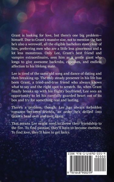 Grant is looking for love, but there's one big problem-himself. Due to Grant's massive size, not to mention the fact he's also a werewolf, all the eligible bachelors steer clear of him, preferring men who are a little less ginormous and a lot less monstrous. Only Lee, Grant's best friend and vampire extraordinaire, sees him as a gentle giant who longs to give awesome backrubs, cupcakes, and endless affection to his lifelong mate.Lee is tired of the same old song and dance of dating and then breaking up. The only steady presence in his life has been Grant, a tried-and-true friend who always knows what to say and the right spot to scratch. So, when Grant finally breaks up with his flighty boyfriend, Lee sees an opportunity to let his carefully guarded heart out of its box and try for something real and lasting.There's a problem, though: Lee has always forbidden romance between friends, an order he's drilled into Grant's head over and over again.That means Lee might need to throw their friendship to the fire. To find passion, they'll have to become enemies. To find love, they'll have to get lucky.