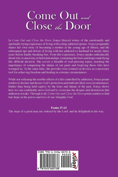 In Come Out and Close the Door, Sonya Brazzel writes of the emotionally and spiritually trying experience of living with a drug-addicted spouse. Sonya poignantly shares her own story of becoming a mother at the young age of fifteen, and the subsequent ups and downs of living with her addicted ex-husband for nearly thirty years before finally breaking free. From this experience, Sonya speaks authentically about why women stay in bad relationships, examining the fears and hopes underlying this difficult decision. She covers a breadth of soul-piercing topics, teaching the importance of conquering the shame of our pasts and forgiving those who have wronged us. At the same time, she provides wise counsel on divorce as a necessary tool for achieving freedom and healing in extreme circumstances. While not softening the terrible effects of a life controlled by addiction, Sonya points readers to declare and decree God's protection and truth into their own circumstances. Rather than being held captive by the fears and shame of the past, Sonya shows how we can confidently move forward to overcome the despair and destruction that addiction wreaks. Through it all, Come Out and Close the Door points readers to find true hope in the power and love of our Almighty God. Psalm 37:23 The steps of a good man are ordered by the Lord: and he delighteth in his way.