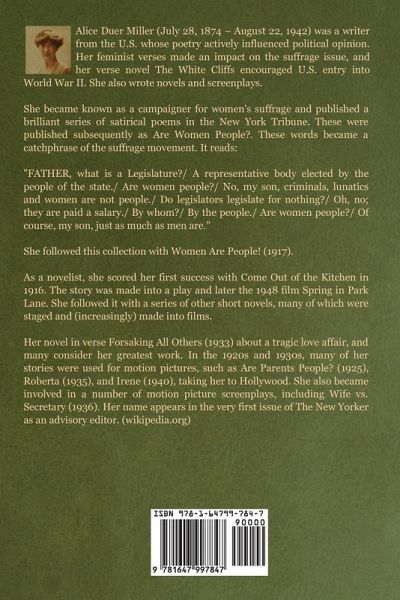 Alice Duer Miller (July 28, 1874 - August 22, 1942) was a writer from the U.S. whose poetry actively influenced political opinion. Her feminist verses made an impact on the suffrage issue, and her verse novel The White Cliffs encouraged U.S. entry into World War II. She also wrote novels and screenplays. She became known as a campaigner for women's suffrage and published a brilliant series of satirical poems in the New York Tribune. These were published subsequently as Are Women People?. These words became a catchphrase of the suffrage movement. It reads: "FATHER, what is a Legislature?/ A representative body elected by the people of the state./ Are women people?/ No, my son, criminals, lunatics and women are not people./ Do legislators legislate for nothing?/ Oh, no; they are paid a salary./ By whom?/ By the people./ Are women people?/ Of course, my son, just as much as men are." She followed this collection with Women Are People! (1917). As a novelist, she scored her first success with Come Out of the Kitchen in 1916. The story was made into a play and later the 1948 film Spring in Park Lane. She followed it with a series of other short novels, many of which were staged and (increasingly) made into films. Her novel in verse Forsaking All Others (1933) about a tragic love affair, and many consider her greatest work. In the 1920s and 1930s, many of her stories were used for motion pictures, such as Are Parents People? (1925), Roberta (1935), and Irene (1940), taking her to Hollywood. She also became involved in a number of motion picture screenplays, including Wife vs. Secretary (1936). Her name appears in the very first issue of The New Yorker as an advisory editor. (wikipedia.org)