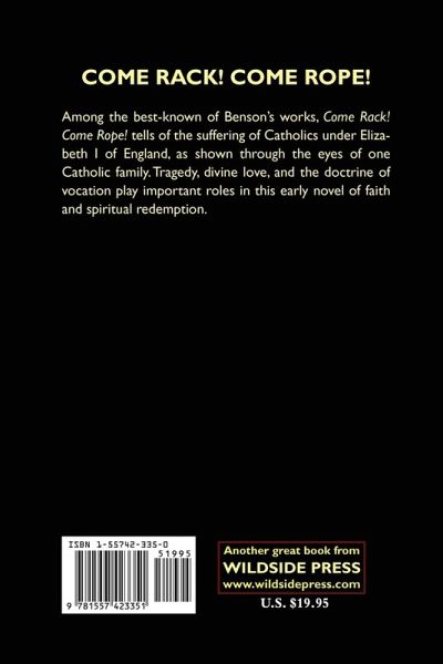 Robert Hugh Benson was an English Catholic priest and author who lived from 18 November 1871 to 19 October 1914. He began his ministry as an Anglican priest before being welcomed and ordained in the Catholic Church in 1903. He also wrote a lot of fiction, including Come Rack! Come to Rope! and the well-known dystopian novel Lord of the World. His works include current fiction, children's stories, plays, apologetics, devotional writings, and historical, horror, and science fiction. In parallel with rising through the ranks to serve as a Chamberlain to Pope Pius X in 1911 and earning the title of Monsignor before passing away a few years later, he continued his writing career. Benson, the younger brother of E. F., A. C., and Margaret Benson, was the youngest child of Edward White Benson, the Archbishop of Canterbury, and his wife, Mary. Robert Hugh Benson attended Eton College for his education before attending Trinity College in Cambridge from 1890 to 1893 to study classics and religion. Benson's father, who was the Archbishop of Canterbury at the time, gave him his ordination as a priest in the Church of England in 1895.