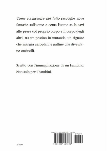Come scomparire del tutto raccoglie nove fantasie: nove brevi racconti illustrati sull'uomo e come l'uomo se la cavi alle prese col proprio corpo e il corpo degli altri, tra un postino in mutande, un signore che mangia aeroplani e galline che diventano ombrelli. Scritta con un'immaginazione fanciullesca, la raccolta unisce una grande accessibilità dei testi a una partecipazione psicologica non solo per bambini.