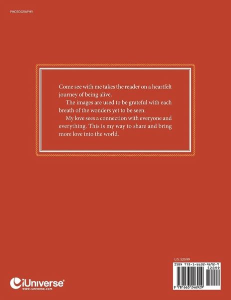 Come see with me takes the reader on a heartfelt journey of being alive. The images are used to be grateful with each breath of the wonders yet to be seen. My love sees a connection with everyone and everything. This is my way to share and bring more love into the world.
