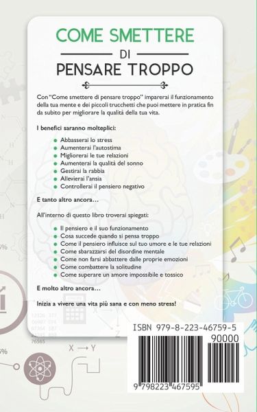 QUELLO CHE STAI PER IMPARARE TI POTREBBE CAMBIARE PER SEMPRE. Come smettere di pensare troppo: il libro che mette un freno al pensiero invadente! Come puoi placare l'incessante ronzio di sottofondo, controllare i tuoi pensieri e metterti sulla via che desideri percorrere? Quante volte ti è capitato che dopo una lunga giornata finalmente ti mettessi a letto e non riuscissi a prendere sonno perché la tua mente era piena di pensieri? È una delle cose più frustranti vero? Ho il libro che fa per te! Con "Come smettere di pensare troppo" imparerai il funzionamento della tua mente e dei piccoli trucchetti che puoi mettere in pratica fin da subito per migliorare la qualità della tua vita. I benefici saranno molteplici:Abbasserai lo stress Aumenterai l'autostima Migliorerai le tue relazioni Aumenterai la qualità del sonno Gestirai la rabbia Allevierai l'ansia Eliminerai il pensiero negativo E tantissimi altri... All'interno di questo libro troverai spiegati:Il pensiero e il suo funzionamento Cosa succede quando si pensa troppo Come il pensiero influisce sul tuo umore e le tue relazioni Come sbarazzarsi del disordine mentale Come non farsi abbattere dalle proprie emozioni Come combattere la solitudine Come superare un amore impossibile e tossico E molto altro ancora... Scoprirai inoltre degli esercizi da mettere subito in pratica per smettere di procrastinare e riprendere il pieno controllo della tua vita. Ricorda: il tuo tempo è troppo prezioso per essere sprecato con pensieri tossici che non ti fanno vivere una vita serena ed appagante. Inizia a vivere una vita più sana e con meno stress