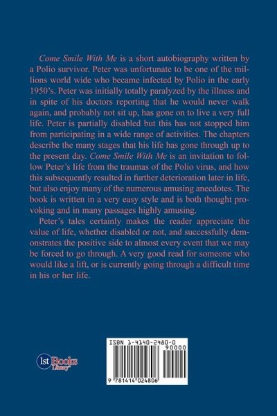 The book is a short inspirational tale of the adventures and experiences of a polio survivor from the early 1950's. The bok is full of amusing anecdotes exploring the first 50 years of his eventful, and certainly not boring life. This is living life to the full in spite of a disability 'Come Smile With Me' is a short autobiography written by a Polio survivor. Peter was unfortunate to be one of the millions world wide who became infected by Polio in the early 1950's. Peter was initially totally paralyzed by the illness and in spite of his doctors reporting that he would never walk again, and probably not sit up, has gone on to live a very full life. Peter is partially disabled but this has not stopped him from participating in a wide range of activities. The chapters describe the many stages that his life has gone through up to the present day. 'Come Smile With Me' is an invitation to follow Peter's life from the traumas of the Polio virus, and how this subsequently resulted in further deterioration later in life, but also enjoy many of the numerous amusing anecdotes. The book is written in a very easy style and is both thought provoking and in many passages highly amusing. whether disabled or not, and successfully demonstrates the positive side to almost every event that we may be forced to go through. A very good read for someone who would like a lift, or is currently going through a difficult time in his or her life.