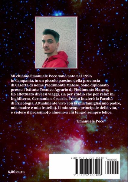 IRDA EDIZIONI Mi chiamo Emanuele Pece, sono nato in un piccolo paesino chiamato Piedimonte Matese in provincia di Caserta. Sono cresciuto in una famiglia bellissima e tranquilla, ma già da piccolo sono iniziate le mie sofferenze, i miei pianti. Quella che sto per raccontarvi non è una semplice biografia che parla di me. Attraverso storie e fatti realmente accaduti, riceverete consigli e aiuto per affrontare alcuni problemi della vostra vita, dal più semplice al più complicato. Non voglio raccontarvi di me, ma voglio che prendiate come esempio le mie esperienze per superare i brutti momenti, perché certe cose possono accadere a tutti e si deve essere pronti e forti per superarle. Niente può fermarvi, siete voi a comandare la vostra vita, scegliete voi la rotta. Vivere è come un gioco: c'è chi ti guarda giocare senza dire nulla, c'è chi deride il tuo gioco dicendo che è una perdita di tempo, ma c'è anche chi ti dice ...