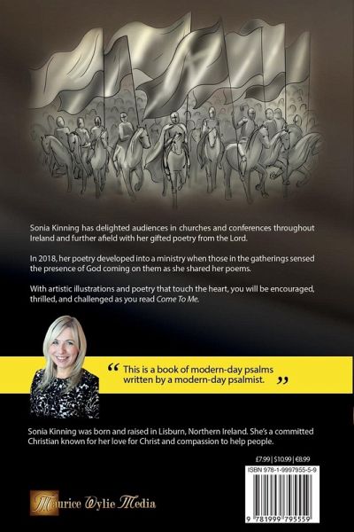 ‘Come to me’ is an inspirational book of poems written by Sonia Kinning and illustrated with dynamic artistry. Sonia has delighted audiences in churches and conferences throughout Ireland and further afield with her gifted poetry from the Lord. In 2018, her poetry developed into a ministry when those in the gatherings sensed the presence of God coming on them as she shared her poems. With artistic illustrations and poetry that touch the heart, you will be encouraged, thrilled, and challenged as you read Come to Me. Senior Pastor Sharon Perry of Abundant Grace Church in Dublin and Belfast says, "You will sense not just the depth of personal experience but a prophetic element that brings much needed edification, exhortation and comfort in the midst of life’s universal challenges. This is a book of modern day psalms written by a modern day psalmist." Pastor Pastor Ronnie McCreanor, Jordanstown Christian Centre says, "Sonia’s poems are inspired by the Holy Spirit and God’s Word, based on a life experienced living for God." International Songwriter/Recording Artist Aaron V Graham says, "Sonia’s work is penned with a depth that will touch your spirit."