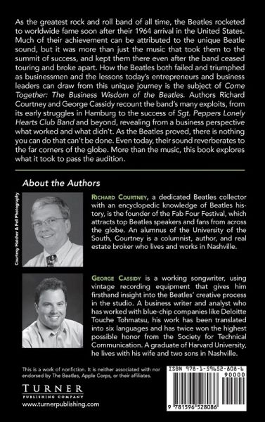 As the greatest rock and roll band of all time, the Beatles rocketed to worldwide fame soon after their 1964 arrival in the United States. Much of their achievement can be attributed to the unique Beatle sound, but it was more than just the music that catapulted them to the summit of success, and kept them there even after the band ceased touring and broke apart. How the Beatles both failed and triumphed as businessmen and the lessons today's entrepreneurs and business leaders can draw from this unique journey is the subject of Come Together: The Business Wisdom of the Beatles. Authors Richard Courtney and George Cassidy recount the band’s many exploits, from its early struggles in Hamburg to the success of Sgt. Peppers Lonely Hearts Club Band and beyond, revealing from a business perspective what worked and what didn’t. More than the music, this book explores what it took to pass the audition.