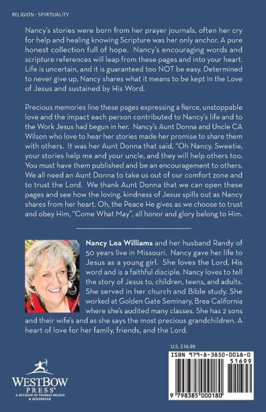 Nancy's stories were born from her prayer journals, often her cry for help and healing knowing Scripture was her only anchor. A pure honest collection full of hope. Nancy's encouraging words and scripture references will leap from these pages and into your heart. Life is uncertain, and it is guaranteed too NOT be easy. Determined to never give up, Nancy shares what it means to be kept in the Love of Jesus and sustained by His Word. Precious memories line these pages expressing a fierce, unstoppable love and the impact each person contributed to Nancy's life and to the Work Jesus had begun in her. Nancy's Aunt Donna and Uncle CA Wilson who love to hear her stories made her promise to share them with others. It was her Aunt Donna that said, "Oh Nancy. Sweetie, your stories help me and your uncle, and they will help others too. You must have them published and be an encouragement to others. We all need an Aunt Donna to take us out of our comfort zone and to trust the Lord. We thank Aunt Donna that we can open these pages and see how the loving. kindness of Jesus spills out as Nancy shares from her heart. Oh, the Peace He gives as we choose to trust and obey Him, "Come What May", all honor and glory belong to Him.