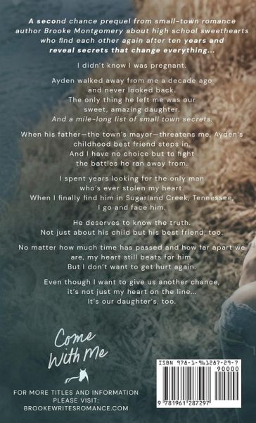 A second chance prequel from small-town romance author Brooke Montgomery about high school sweethearts who find each other again after ten years and reveal secrets that change everything... I didn't know I was pregnant. Ayden walked away from me a decade ago and never looked back. The only thing he left me was our sweet, amazing daughter. And a mile-long list of small town secrets. When his father-the town's mayor-threatens me, Ayden's childhood best friend steps in. And I have no choice but to fight the battles he ran away from. I spent years looking for the only man who's ever stolen my heart. When I finally find him in Sugarland Creek, Tennessee, I go and face him. He deserves to know the truth. Not just about his child but his best friend, too. No matter how much time has passed and how far apart we are, my heart still beats for him. But I don't want to get hurt again. Even though I want to give us another chance, it's not just my heart on the line... It's our daughter's, too. Come With Me is a prequel in the Sugarland Creek series. If you love second chances, secret child, and small town tropes, you'll fall hard for Ayden, Laney, and Serena! Each book in the series is a stand-alone and ends in a happily ever after.
