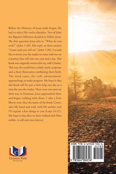Before the Ministry of Jesus really began, He had to select His twelve disciples. Two of John the Baptist's followers decided to follow Jesus. The first question Jesus asks is, "What do you seek?" (John 1:38). His reply to their answer "Come and you will see" (John 1:39). I would like to invite you the reader to come with me on a journey that will take one year and a day. This book was originally written for my wife Charise. This way she could have a daily word, scripture and a short illustration combining them both. The word come, the verb, advancement, approaching, to make progress. My hope is that this book will be just a little help one day at a time for you the reader. There were two men on their way to Emmaus, Jesus approached them and began walking with them. I take a little liberty now, thus the name of the book: Come, take My hand and walk with Me awhile, and I'll explain a few things to you (Luke 24:27). My hope is that after we have walked with Him awhile, it will turn into forever.