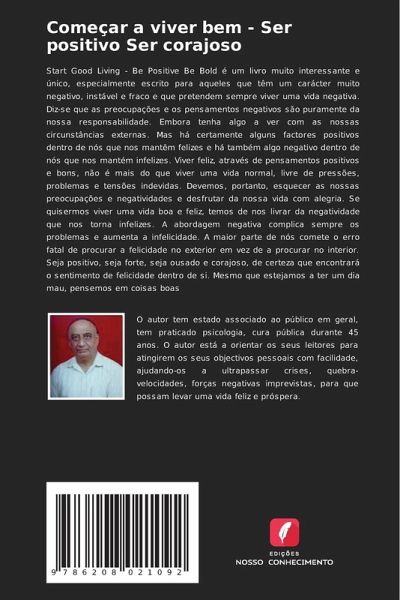Start Good Living - Be Positive Be Bold é um livro muito interessante e único, especialmente escrito para aqueles que têm um carácter muito negativo, instável e fraco e que pretendem sempre viver uma vida negativa. Diz-se que as preocupações e os pensamentos negativos são puramente da nossa responsabilidade. Embora tenha algo a ver com as nossas circunstâncias externas. Mas há certamente alguns factores positivos dentro de nós que nos mantêm felizes e há também algo negativo dentro de nós que nos mantém infelizes. Viver feliz, através de pensamentos positivos e bons, não é mais do que viver uma vida normal, livre de pressões, problemas e tensões indevidas. Devemos, portanto, esquecer as nossas preocupações e negatividades e desfrutar da nossa vida com alegria. Se quisermos viver uma vida boa e feliz, temos de nos livrar da negatividade que nos torna infelizes. A abordagem negativa complica sempre os problemas e aumenta a infelicidade. A maior parte de nós comete o erro fatal de procurar a felicidade no exterior em vez de a procurar no interior. Seja positivo, seja forte, seja ousado e corajoso, de certeza que encontrará o sentimento de felicidade dentro de si. Mesmo que estejamos a ter um dia mau, pensemos em coisas boas