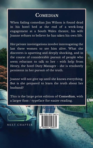 When fading comedian Jim Wilson is found dead in his hotel bed at the end of a week-long engagement at a South Wales theatre, his wife Joanne refuses to believe he has taken his own life. Her private investigations involve interrogating the last three women to see him alive. What she discovers is upsetting and deeply shocking, and in the course of considerable pursuit of people who seem reluctant to talk to her - with help from Henry, the hotel Duty Manager - she is resolutely persistent in her pursuit of the truth. Joanne will not give up until she knows everything. But is she prepared to learn the truth about her husband? This is the large print edition of Comedian, with a larger font / typeface for easier reading.