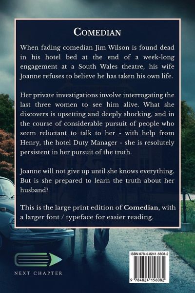 When fading comedian Jim Wilson is found dead in his hotel bed at the end of a week-long engagement at a South Wales theatre, his wife Joanne refuses to believe he has taken his own life. Her private investigations involve interrogating the last three women to see him alive. What she discovers is upsetting and deeply shocking, and in the course of considerable pursuit of people who seem reluctant to talk to her - with help from Henry, the hotel Duty Manager - she is resolutely persistent in her pursuit of the truth. Joanne will not give up until she knows everything. But is she prepared to learn the truth about her husband? This is the large print edition of Comedian, with a larger font / typeface for easier reading.